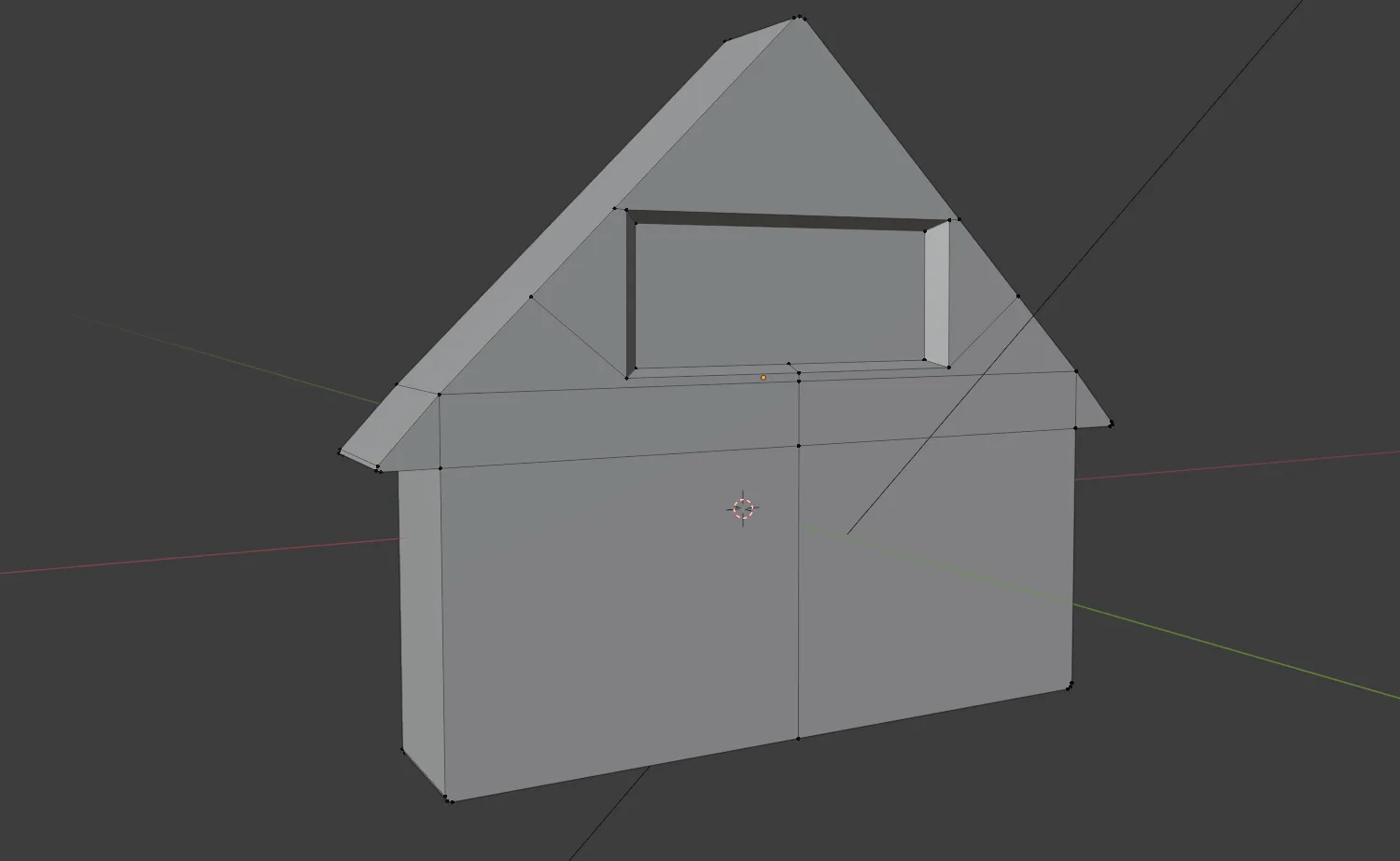 From a cube, in edit mode I subdivided and used the knife tool to create the main house shape. I pulled one top corner over and up to make the peak and then deleted the other corner giving a triangular shape to the roof. I used the knife tool to create the vertices giving me points to make the eaves. Using the knife tool again, I created the outline for the screen and inserted a face. I recessed the face back into the body to make the basic shape of the screen.