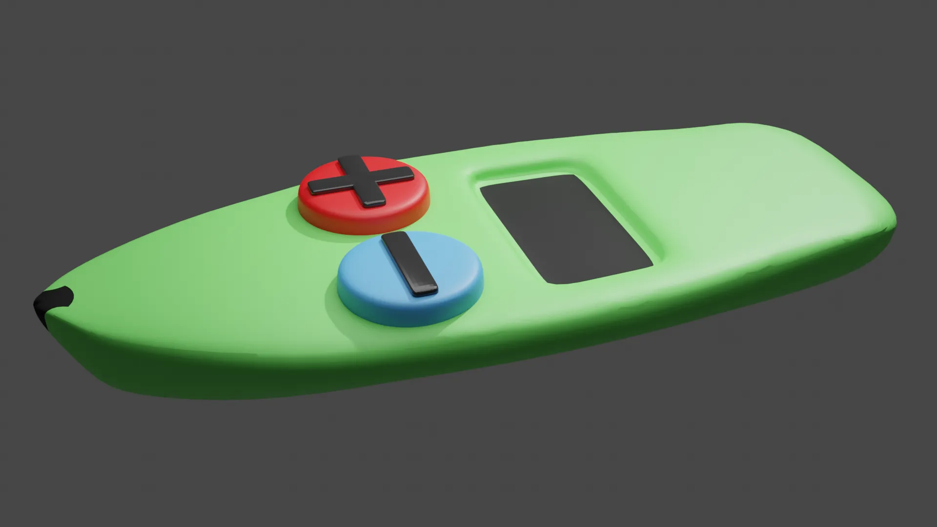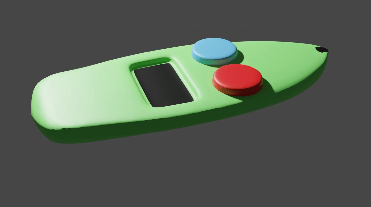 To match the design of the wall unit, I opened the shading workspace and created a green material for the main body. Next, I had to decide where the screen was going to go. I placed it towards the rear middle of the remote. This allowed the buttons to be located towards the front of the remote. When the remote is settled in the palm of the hand the buttons are easily accessible by the thumb. I textured the LCD with the same black material I used on the wall unit. To finish off, I created the buttons by making a cylinder and applying a subdivision surface modifier to it. I used loop cuts to exemplify the angles I wanted to be smooth rather than non-existent, otherwise the modifier would turn it into a spike.