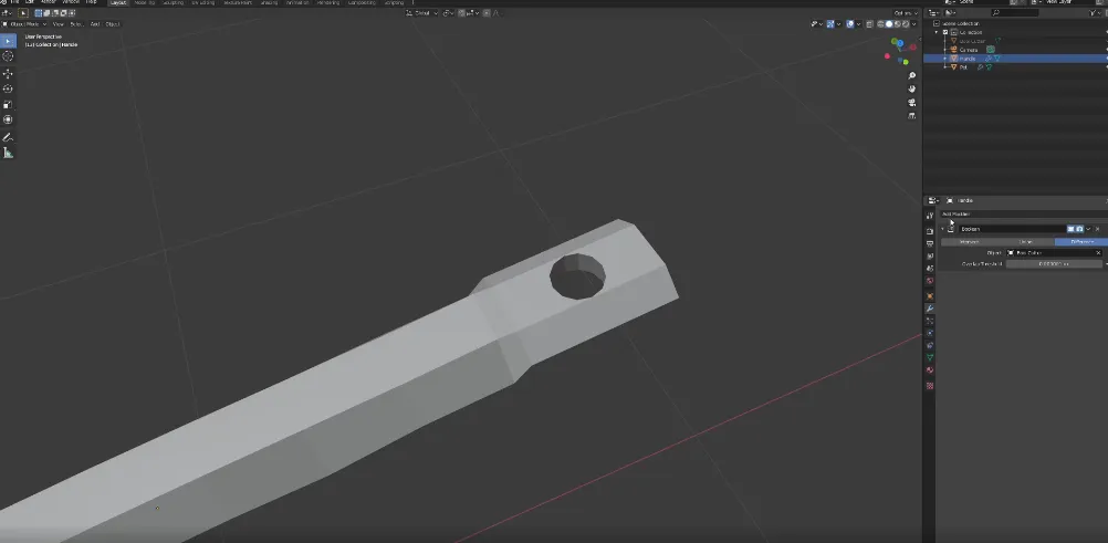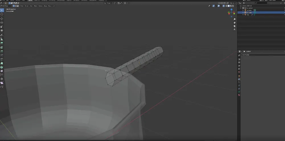 The handle was surprisingly complicated. I started with a cylinder, scaled and rotated it into position. Initially my cylinder had too many sides so I deleted it and remade with six sides. As my pan was currently upside down I needed to rotate it and then in edit mode I added loop cuts along the handle giving me geometry to work with. I then had to ensure the handle was not sticking through the pan.