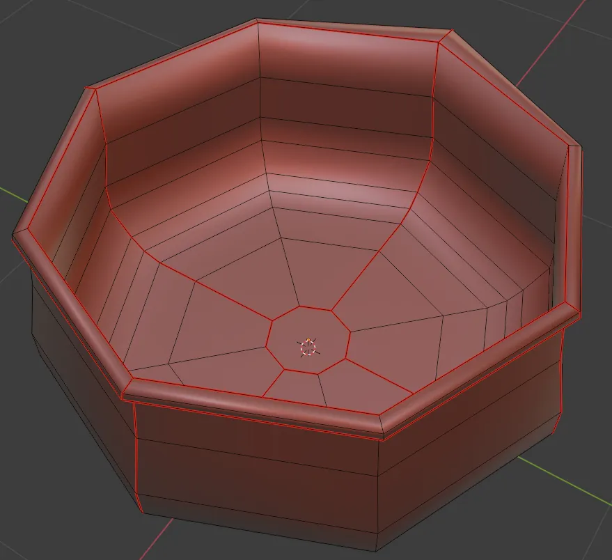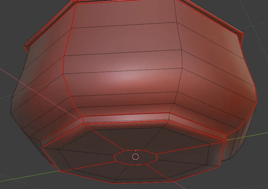 In the reference imagery, the top of the lid had a decorative staircase effect. There were alternating acute, obtuse and reflex angles all slightly different from 90°. I started by creating 90° steps. Then selected the rim of each step and bevelled it. I adjusted their position to slightly offset the slope of the steps to match my reference.
